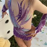 Unikatni triko za ritmičku gimnastiku, klizanje, fizičko, ples sa reckavom suknjicom. Trajna štampa. Ukrašen sa 250 cirkona. Boje su postojane u pranju ali zbog cirkona ne preporučuje se mašinsko pranje.