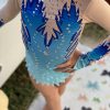 Unikatni triko za ritmičku gimnastiku, klizanje, fizičko, ples sa reckavom suknjicom. Trajna štampa. Ukrašen sa 250 cirkona. Boje su postojane u pranju ali zbog cirkona ne preporučuje se mašinsko pranje.